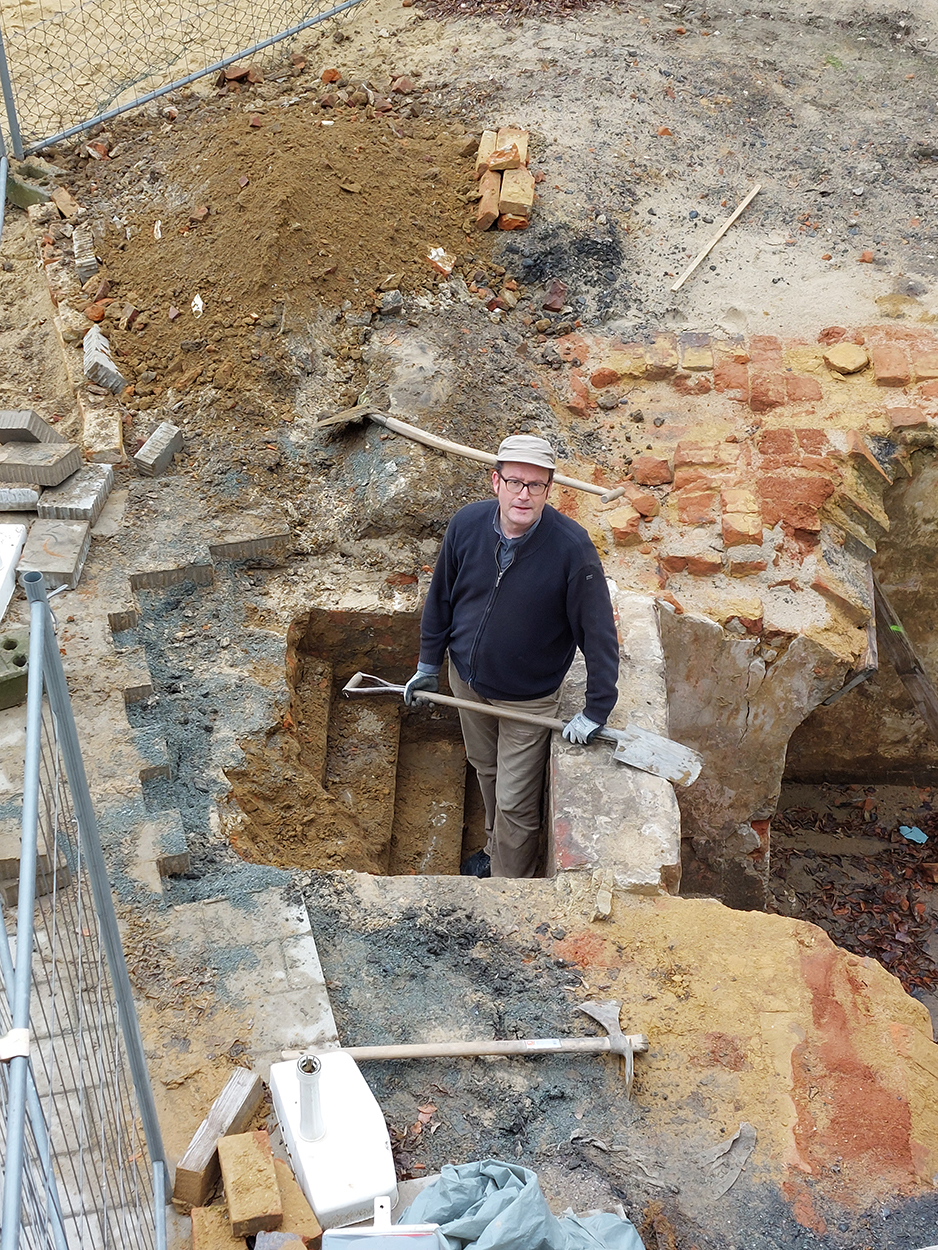 Einstieg durch eine Bodenluke: Bevor Mitte März die Billerbecker Baufirma Menke mit den Tiefbauarbeiten am historischen „Keller Pins“ unweit der Dülmener Viktorkirche beginnt, wurde noch einmal die archäologische Freilegung des Mauerwerks ausgeweitet. Der Grund: Um später nicht mittels eines aufwändigen Einstiegs durch die Scheiben der geplanten gläsernen Pyramide in den Kellerbereich zu gelangen, wird der Abstieg von außen erfolgen – also von außerhalb jenes Grundrisses, den die Pyramide (eigentlich ein Tetraeder) überwölbt. „Die alte Außentreppe bietet sich da geradezu an“, findet Archäologe Dr. Gerard Jentgens. Da dessen Grabungskräfte momentan krankheitsbedingt stark dezimiert wurden, konnte am Montag, 14. März, nur auf eine angelernte Hilfskraft zurückgegriffen werden. „Es wurde die Verfüllung der Treppenanlage beseitigt“, erklärt Pfarrer Markus Trautmann; „demnächst wird die Vermauerung der früheren Tür am Abgang der Treppe wieder beseitigt. Diese wurde vermutlich nach dem Erwerb des Hauses Pins durch die Stadt Dülmen vorgenommen, als hier ab 1939 ein „Heimathaus“ eingerichtet wurde.