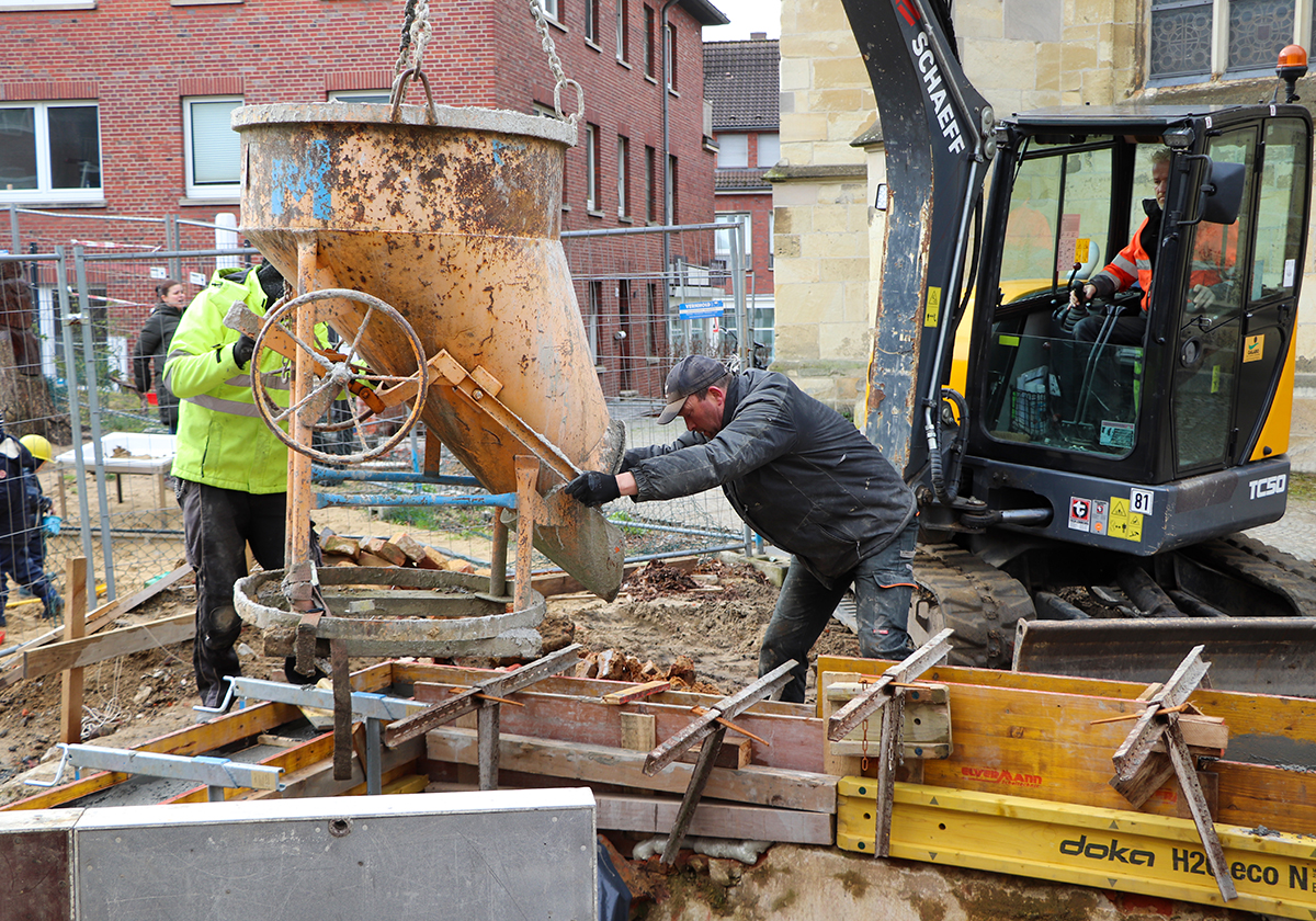 Ein wichtiger Schritt für die Gestaltung des künftigen Dülmener Gedenkorts „Keller Pins“ unweit von St. Viktor: Am Freitagmorgen (8.4.) füllten zwei Mitarbeiter der Billerbecker Baufirma Menke, unterstützt von der am Kirchplatz tätigen Firma Galabo aus Münster, Flüssigbeton in die in den Tagen zuvor erstellte Verschalung. In der kommenden Woche wird die Verschalung entfernt; dann muss der Beton rd. 14 Tage aushärten. Schon jetzt zeichnet sich der dreieckige Grundriss über dem freigelegten historischen Kellergeschoss aus dem 18. Jahrhundert ab; auf diesem wird sich ab dem Frühsommer die Stahl-Glas-Konstruktion eines Tetraeders in Höhe von rd. 2 Metern erheben. Schon bald nach Ostern können die im Bereich von „Keller Pins“ noch ausstehenden Pflaster- und Bodenarbeiten in Angriff genommen werden.