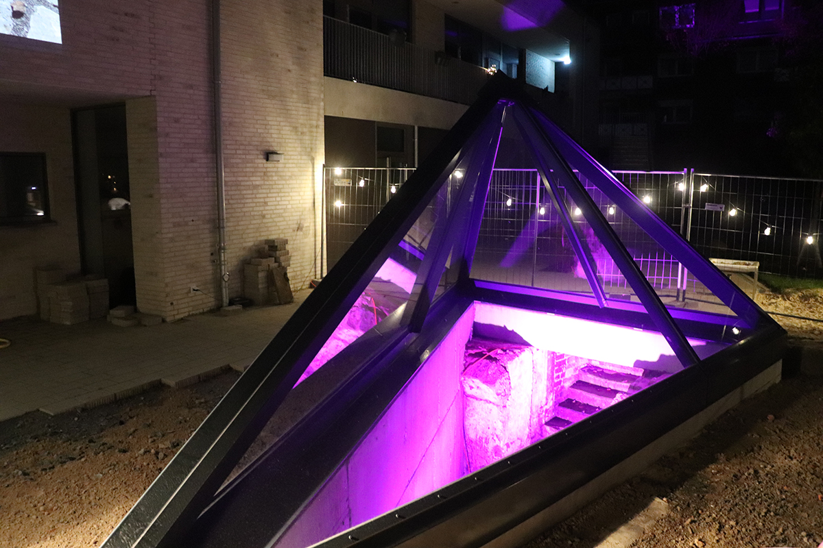 Ralf Lux macht in diesen Tagen seinem Namen alle Ehre: Denn der Hausmeister des „einsA“ hat rechtzeitig zum Dülmener Winter eine farbige Licht-Installation im künftigen Dülmener Gedenkort „Keller Pins“ angelegt. Einen ersten Testlauf gab es bereits am 28. Oktober, als durch ehemalige Schülerinnen und Schüler der Hermann-Leeser-Schule neben der Viktorkirche drei „Stolpersteine“ für die einst hier ansässige Familie Pins neu verlegt wurden. „Die Gäste des Abends waren von dem farbigen Lichtspiel aus der Tiefe sehr angetan“, berichtet Christiane Daldrup vom Kirchenvorstand St. Viktor. „Mit jedem Farbton werden die historischen Mauerreste ganz unterschiedlich präsentiert und wahrgenommen“, ergänzt Pfarrer Markus Trautmann. „Eine Zeitschaltuhr sorgt dafür, dass ab der Eröffnung des Dülmener Winters das Farbspiel mit einbrechender Dämmerung startet“, erläutert Ralf Lux. Weitere gestalterische Maßnahmen und technische Effekte rund um „Keller Pins“ folgen in den kommenden Wochen.