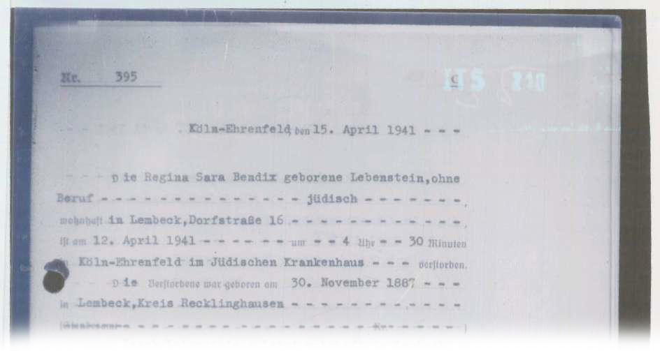 Neue Erkenntnis: Bei der Recherche und Würdigung der Schicksale von Dülmener Juden ging man bislang irrtümlich davon aus, dass Regina Bendix (geb. 1887 und seit 1928 mit ihren drei Kindern wohnhaft am Dülmener „Kreuzweg“) das Schicksal ihrer Tochter Friederike geteilt habe: Demnach sei sie mit ihr 1934 gemeinsam in die Niederlande geflohen und von dort 1942 in die Vernichtung deportiert worden. Diese Auskunft gibt etwa der „Stolperstein“ für Regina Bendix aus dem Jahr 2007. (Auch ein einschlägiger Meldebogen über Regina Bendix in der Holocaust-Gedenkstätte Yad Vashem nennt als „death place“ fälschlicherweise Ausschwitz.) Jüngere Recherchen haben nun zweifelsfrei ergeben, dass Regina Bendix im Sommer 1936 zu einer Schwägerin nach Südlohn zog; dort war sie auch noch zur Volkszählung 1939 gemeldet. Auch wenn ihr die Deportation erspart blieb, so waren die kommenden Ereignisse ebenfalls tragisch: Sie erkrankte an Gebärmutterkrebs und starb schließlich am 12. April 1941 im Israelitischen Krankenhaus in Köln. Nach ihrer Grabstätte auf einem der drei jüdischen Friedhöfe in Köln wird zeitnah recherchiert.