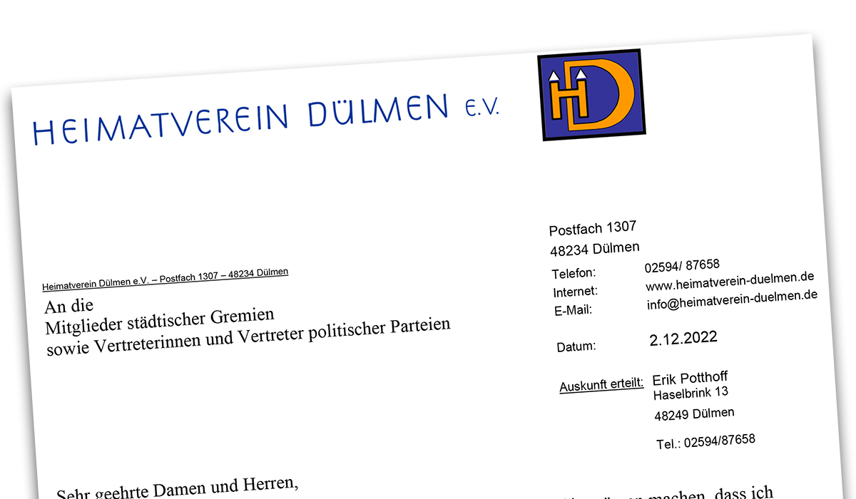 Mit einer besonderen Überraschung wurde in diesem Jahr der Dülmener Stadtrat in die Weihnachtsferien entlassen: Der Heimatverein Dülmen ließ allen Stadtverordneten und weiteren kommunalen Mandatsträgern die im Sommer erschienene Broschüre „Sie müssen machen, dass ich wegkomme“ über den Dülmener Viehhändler Louis Pins (1874-1939) zukommen. Das Anliegen dieser Weihnachtsgabe wird in einem Begleitschreiben >>> erläutert, das wir im vollem Umfang dokumentieren.