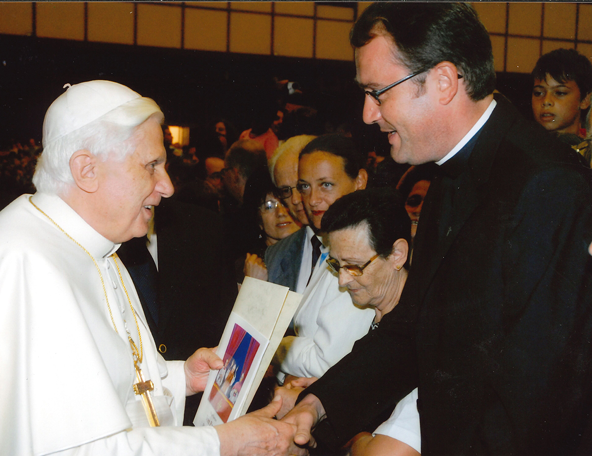großes Foto: Pfarrer Markus Trautmann überreicht dem Papst das Buch „Vom Papst den Kindern erzählt“, Sommer 2006