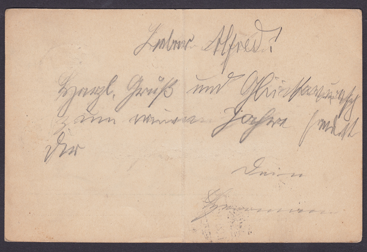 Auf der Suche nach einer alten Ansichtskarte von Dülmen führte der Link bei eBay zu einem Antiquariatshändler aus Singapur. Unter dem Stichwort "Duelmen" war nur ein Treffer verzeichnet. Die als Thumbnail angezeigte Karte wirkte zunächst unscheinbar. Die vergrößerte Ansicht zeigte jedoch eine Grußkarte, die Hermann Leeser seinem Bruder Alfred zum Jahreswechsel 1899/1900 schickte: