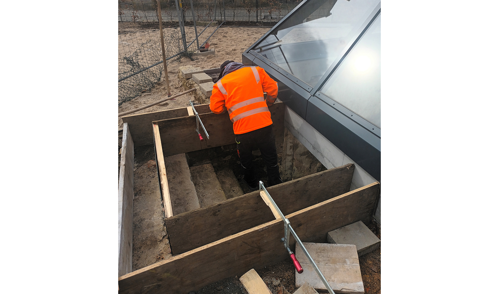 Aus dem Umfeld vom „Keller Pins“ können weitere bauliche bzw. gestalterische Maßnahmen vermeldet werden: In diesen Tagen fertigen Mitarbeiter der Münsteraner Firma GALABO eine Verschalung oberhalb der früheren Kellertreppe vom Haus Pins an. Hier wird bald eine Einstiegsluke bzw. Entlüftung des historischen Kellerraums angelegt.