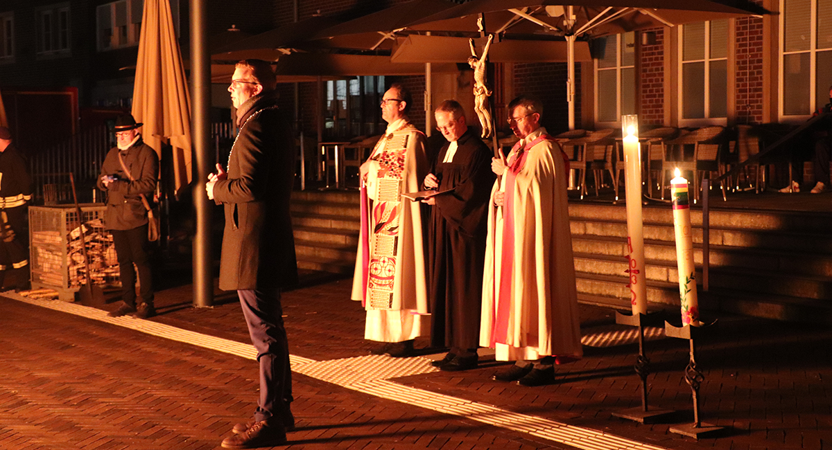 Mit eindrucksvollen Worten zitierte der Dülmener evangelische Pfarrer Gerd Oevermann in seiner diesjährigen Ansprache zum Abschluss der traditionellen Pestprozession am Ostermorgen (9. April) den jüdischen Religionsphilosophen Schalom Ben-Chorin (1913-1999): „Wer Frieden sucht, wird den andern suchen, wird Zuhören lernen, wird das Vergeben üben, wird das Verdammen aufgeben, wird vorgefasste Meinungen zurücklassen, wird das Wagnis eingehen, wird an die Änderung der Menschen glauben, wird Hoffnung wecken, wird dem andern entgegengehen, wird zu seiner Schuld stehen, wird geduldig dranbleiben, wird selber von Gottes Friede leben. – Suchen wir den Frieden!“ – Die Dülmener Pestprozession erinnert an das Jahr 1382, als die Pest große Teile der Dülmener Bevölkerung, darunter die gesamte Geistlichkeit, hinweggerafft hatte. Damals improvisierte der Bürgermeister einen Umgang durch Dülmen, bei dem er selbst ein Kreuz vorantrug, gefolgt von einigen Bürgern mit Schellen und Gesängen. Bis heute folgt das jeweilige Dülmener Stadtoberhaupt diesem überlieferten Brauch.