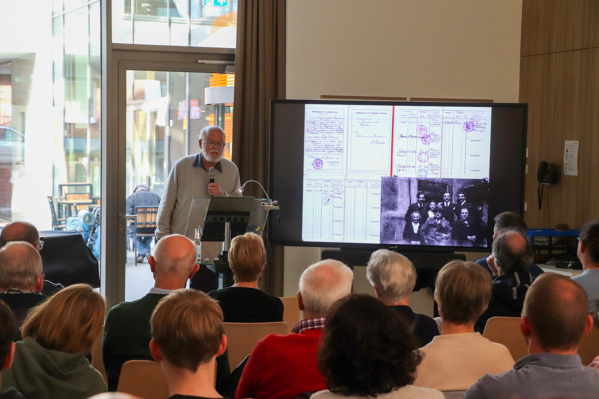 … das waren die letzten Worte von Isidor Davidson, Großvater von Prof. Dr. Hans Davidson. Isidor starb 1939 bei einem Motoradunfall in Zwolle (die DZ berichtete) und ist der Einzige der Familie, der dort auf dem jüdischen Friedhof beerdigt ist. „Die anderen Davidsons starben in Auschwitz,Sobibor, in Konzentrations- und Vernichtungslagern. Dass ich heute Abend hier sein kann is a miracel, ein Wunder.“ Im vollbesetzten Saal des einsA zieht der emeritierte Medizinprofessor und profunde Holocaust-Experte Hans Davidson seine Zuhörer in den Bann. Eindrucksvoll kombiniert er private Fotos mit historischen Bildquellen und stellt den Zuhörern vor dem geschichtlichen Hintergrund der 20er bis 40er Jahre des 20 Jahrhunderts einzelne Familienmitglieder und deren Schicksal vor. Etwa Bahrend, der im Widerstand war, denunziert, verhaftet und nach einem Scheinprozess in Berlin hingerichtet wird. In Auschwitz kommen seine Onkel Hermann und Walter ums Leben; Deportation, Selektion, Typhus, Vernichtung durch Arbeit, Ermordung durch Zyklon B – , auch die sechsjährige Femmystirbt hier. „Ich erzähle es, um zu verdeutlichen, dass nicht, wie oft gesagt wird, sechs Millionen Juden von den Nazis ermordet wurden, sondern weil sechs Millionen Mal ein einziger Jude ermordet wurde“, so Davidson. Und das Wunder?