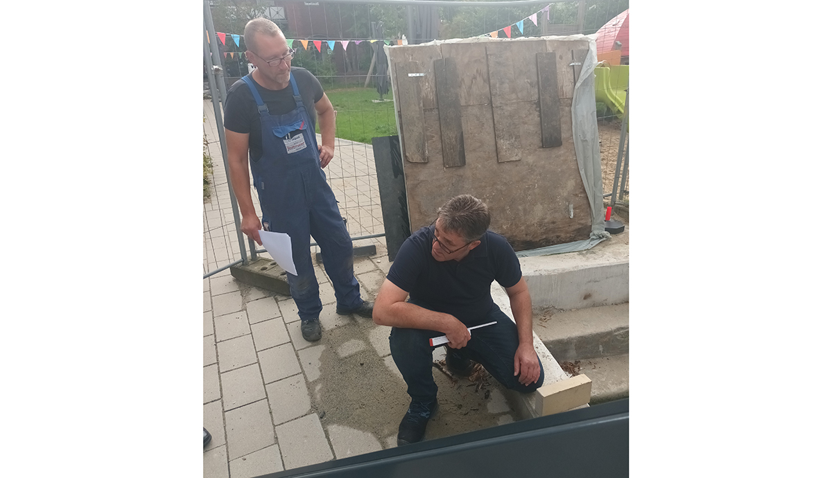 In diesen Tagen konnten Helmut Schlüter und Carsten Jagusch von der Dülmener Metallbaufirma Jostmeier den Treppenabgang zum „Keller Pins“ ausmessen – denn jetzt wird es ernst: Im Laufe des September wird hier eine stabile Einstiegsluke montiert; der störende Bauzaun kann dann verschwinden. Wichtig sind verschiedene Faktoren: Es darf künftig kein Regenwasser mehr direkt in den Kellerbereich gelangen, gleichwohl ist eine optimale Luftzufuhr für das Klima unter dem gläsernen Tetraeder entscheidend. Die gesamte Ausführung muss zudem allen Ansprüchen eines Kindergartenaußenbereichs genügen.