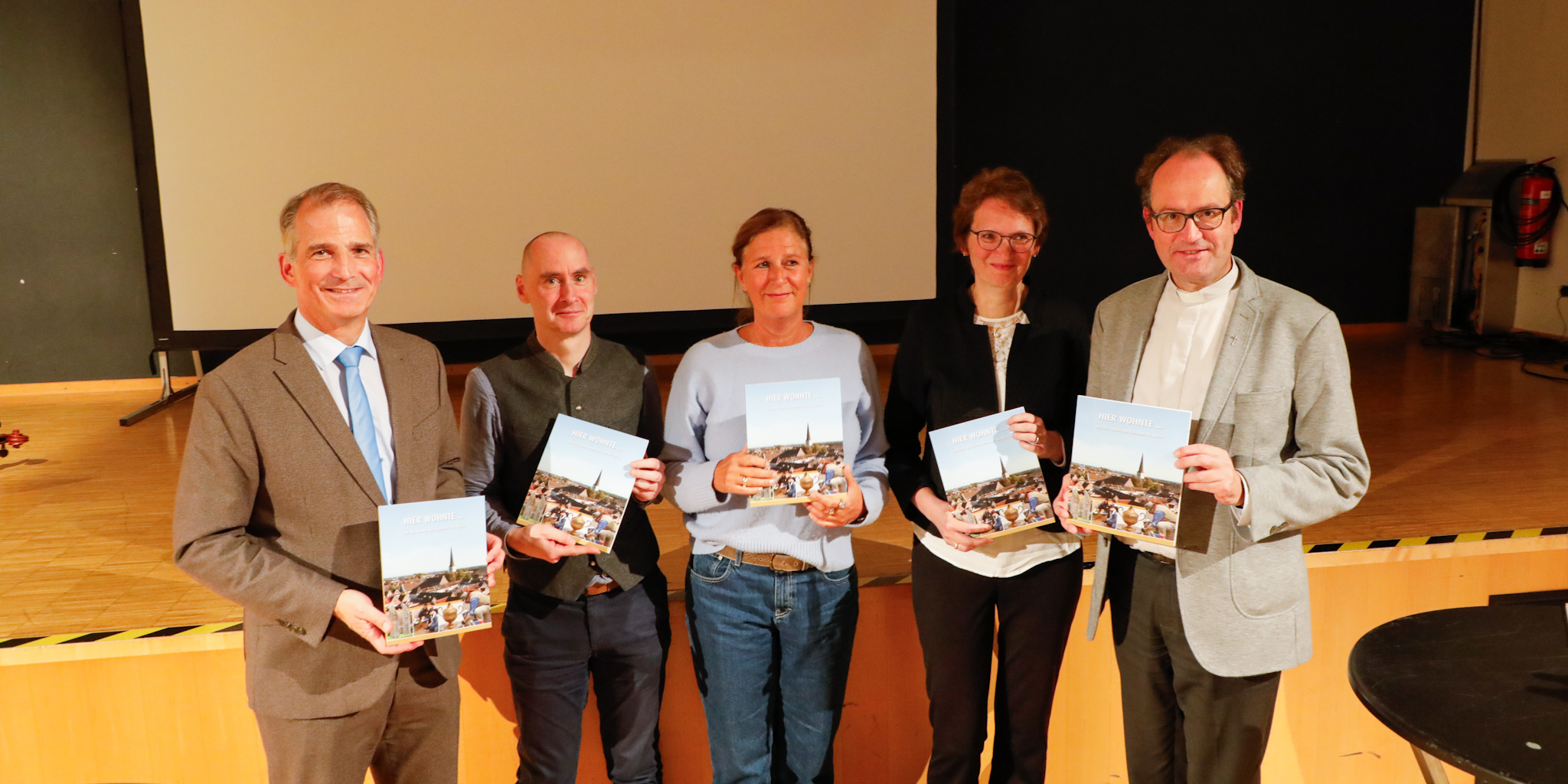 Vor zahlreich erschienenen Gästen moderierte Erik Potthoff als Vorsitzender des Dülmener Heimatvereins am Mittwochabend im Forum Bendix eine kurzweilige und spannende Buchpräsentation: Die Rede ist von der Vorstellung der Neuerscheinung „Hier wohnte … – Auf den Spuren von Dülmener NS-Opfern“. Dank eines großzügigen Sponsoring steht nun allen Interessierten in Dülmen und darüber hinaus ein kompaktes und niederschwelliges Kompendium zur Verfügung, angelegt als ein literarischer Stadtrundgang und reich illustriert. „Es lassen sich bis heute immer neue Spuren der Vergangenheit und heutige Perspektiven“ finden, erklärte Potthoff das publizistische Engagement des Heimatvereins. Im Interview mit Potthoff stellten die vier am Werk beteiligten Autorinnen und Autoren je ein „Lieblingsfoto“ aus dem Buch vor. So erläuterte Dr. Stefan Sudmann anhand einer lebendigen Straßenszene der 1930er Jahre die „Alltäglichkeit“ des Nationalsozialismus in Dülmen – zwischen „Braunem Haus“ und jüdischem Geschäft Eichengrün. Ebenfalls aus jenen Jahren erklärte Markus Trautmann ein Foto, auf dem Ernst Leeser und seine Söhne samt Chauffeur vor dem Kirchplatz von St. Viktor in die Kamera blicken, durchaus mit großbürgerlichem Selbstbewusstsein. Umso tragischer sei dann der soziale Abstieg in der chilenischen Emigration gewesen. Ein weiteres Familienfoto, in diesem Fall von ca. 1910, stelle Dr. Andrea Peine vor: Es zeigt den zweieinhalbjährigen Hermann Davidson, gekleidet in eine Kindervariante eines Admiralsmantels. „Ein so frühes Kinderbild zu kennen, und dann seine letzten Akten aus der Krankenbaracke von Auschwitz einzusehen – das geht einem nahe“, so ihre Empfindung. In die heutige Gegenwart führte die Zuhörer ein Motiv, das Christiane Daldrup vorstellte, nämlich ein Foto vom erst jüngst ausfindig gemachten Grabplatz von Regina Bendix in Köln. „Ihr Enkel Marc Bendix in Kanada war durch dieses Rechercheergebnis sehr angerührt“, berichtetet sie. Überhaupt seien die während der Entstehung des Buches entstandenen Kontakte zu Nachgeborenen aus Dülmener jüdischen Familien sehr anregend und motivierend gewesen, war sich das Autorenteam einig. Musikalisch umrahmt wurde die Veranstaltung durch Heinrich Rövekamp, der Solostücke am Cello zu Gehört brachte.