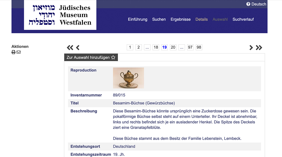 Seit kurzem lässt sich über die Homepage des in Dorsten ansässigen Jüdischen Museums Westfalen ein großer Teil der Objektdatenbank einsehen. Sie umfasst derzeit etwa 500 Objekten – von klassischen Holzstichen über Chanukka-Leuchter bis hin zu Drucken aus dem 16. Jahrhundert. „Das Jüdische Museum Westfalen ist damit einen wichtigen Schritt im Bereich der Digitalisierung gegangen“, erklärt Kuratorin Ayleen Winkler. Zum einen sei die Sammlung so einer breiten Öffentlichkeit und Wissenschaftlern zugänglich, zum anderen diene die Digitalisierung auch dem Schutz und Erhalt der Objekte. Winkler weiter:„Umgesetzt wurde dieser zeit- und arbeitsintensive Prozess in einem mehrjährigen Projekt, das extern gefördert wird. In den kommenden Monaten wird auch der restliche Bestand nach und nach online gestellt werden.“ Im Frühjahr werde das Projekt abgeschlossen.