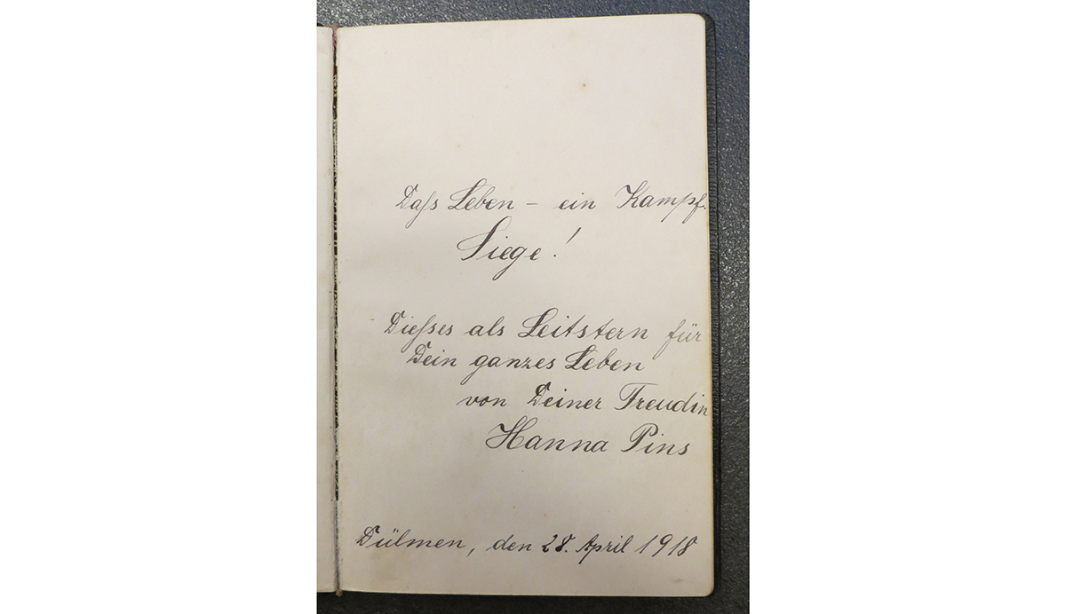 Der Beitrag der knapp zwölfjährigen Hanna Pins (1906-1982), Tochter des jüdischen Viehhändlers Louis Pins und dessen Frau Fanny, spricht so gar nicht „von süßen Stunden“. Die Widmung, zwar in der Orthographie etwas unsicher, dafür mit festem Schwung zu Papier gebracht, lautet: „Das Leben – ein Kampf. Siege!“ Und darunter: „Dieses als Leitstern für dein ganzes Leben von Deiner Freundin Hanna Pins.“ Formuliert wurden die Zeilen am 28. April 1918, also wenige Tage nach der Erstkommunion von Hedwig. „Für ein Kind ist so eine Äußerung höchst untypisch“, findet Hannelore Schulze Weddern, die Enkelin der einstigen Poesiealbumbesitzerin. Was mag der Hintergrund dieser so ernsten, fast harten Worte sein, die Hanna Pins ihrer Freundin als „Leitstern“ empfahl? War der „Kampf“ eine Art Familienmentalität, von den Eltern Pins ihrer Tochter vermittelt? Oder schwebten die damals aktuellen Kriegsereignisse um die deutsche „Frühjahrsoffensive“ im Hintergrund? Waren es allgemein die Entbehrungen und Ängste während des Ersten Weltkriegs, die auch in einem Kind ihre Spuren hinterließen? Jedenfalls sollte rund 20 Jahre später das Leben für Hanna Pins tatsächlich ein Kampf ums Überleben werden: Im letzten Augenblick konnte sie Ende 1940 mit ihrer Stiefmutter Jenny nach Uruguay fliehen; ihr Vater Louis verstarb im Sommer 1939 in Gestapohaft.